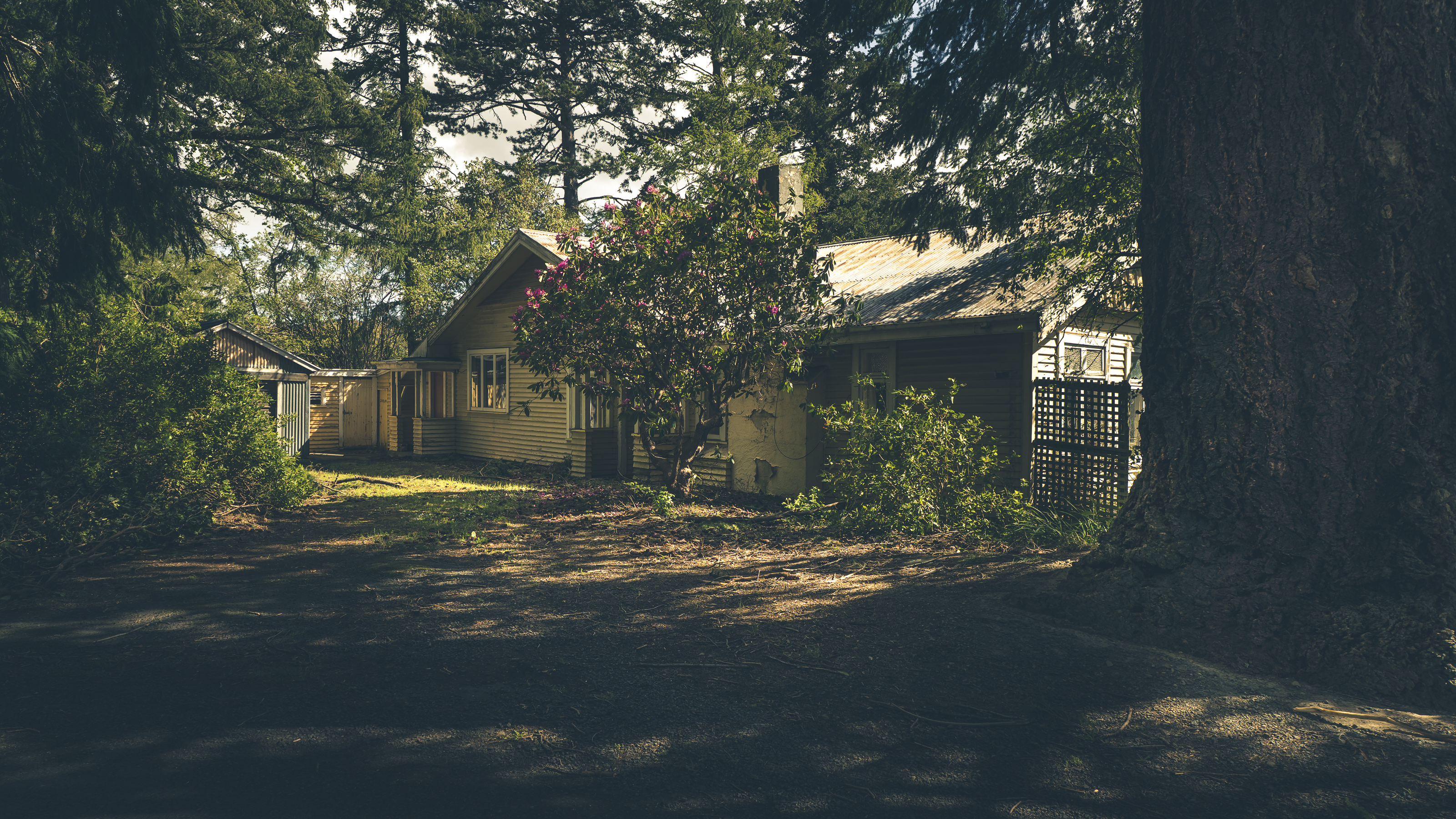 Cottage under trees, shifts ended, lights out, stories kept.